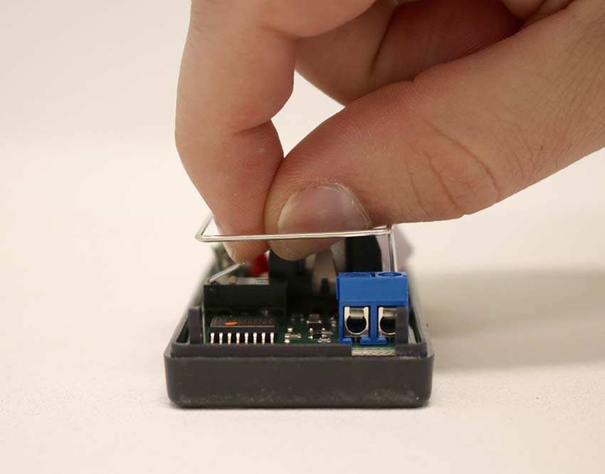Now that the tab has been bent, close the lid of the sensor. To do this, secure the end opposite the locking tab, then rock the lid down over the locking tab securing it in place.