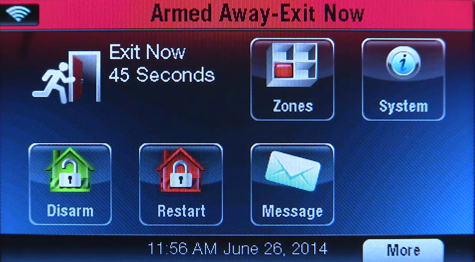 Leaving - Armed Away (all sensors in your home will be activated, including motion detectors). The panel will have an audible exit delay countdown.