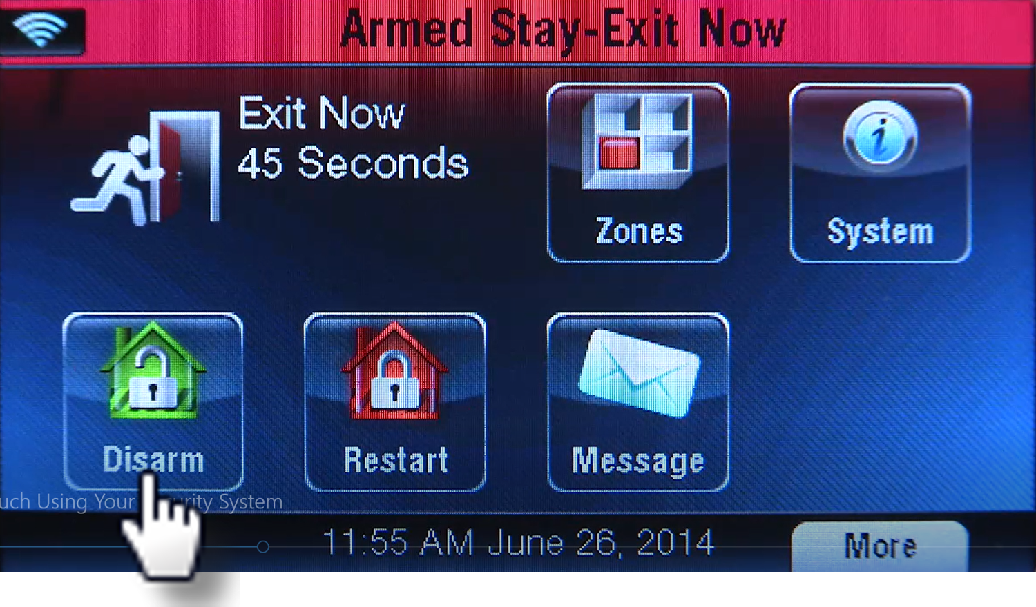 Enter your four digit user code. If done correctly, the system beeps and announces "Disarmed". When arriving home, the panel will start beeping to alert you to disarm your panel.